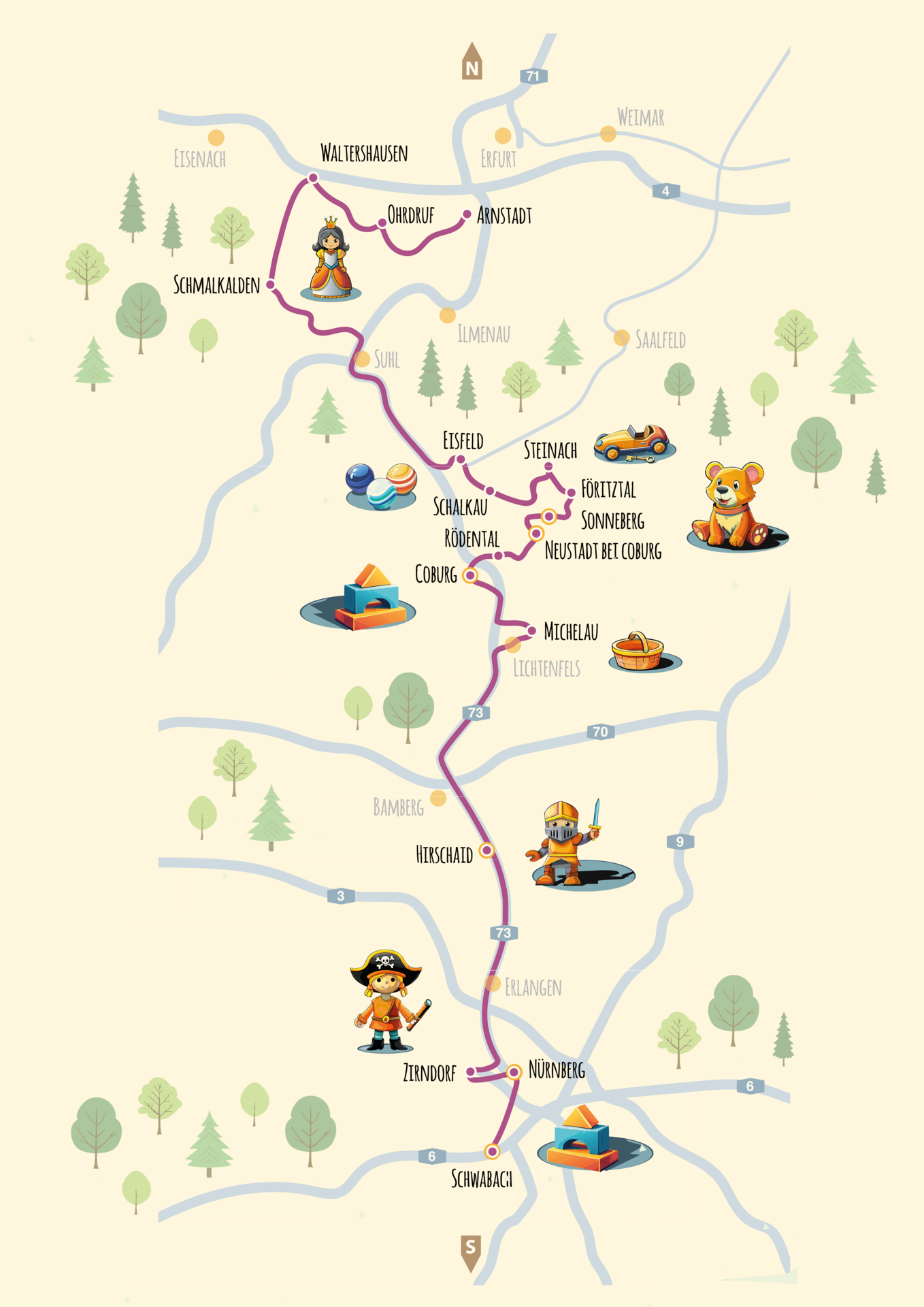 Erleben Sie die Urlaubsregion Coburg.Rennsteig auf spielerische Weise: Einst war sie die „Werkstatt des Weihnachtsmannes“ mit den weltgrößten Produktionsstätten für Spielzeug, heute ist sie eine wichtige Station auf der Deutschen Spielzeugstraße. Bis in das 16. Jahrhundert lässt sich die Spielzeugtradition in der Region zurückverfolgen. Drechsler und Schnitzer waren die ersten, die aus dem Holz des Thüringer Waldes die frühen Spielwaren anfertigten.