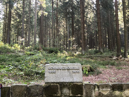 Die Tour folgt jetzt der Ausschilderung "rotes Dreieck auf weißem Quadrat". Der Einstieg ist links unterhalb der Hütte. Leicht bergab wandern Sie zur Schwarzaquelle und zum Schwarzastausee. Am Ende der Staumauer biegen Sie rechts ab und folgen dem befestigten Weg nach Scheibe-Alsbach. Direkt am Sportplatz biegt der Weg nach links in das Gläserstal. Dieses sehr schöne Tal durchqueren Sie bis zum Ende. Hier trifft der Weg auf eine Teerstraße. Ihr folgen Sie nach links bis zum Waldrand. Jetzt treffen Sie auf den "Goldpfad" dem Sie zurück nach Limbach folgen.